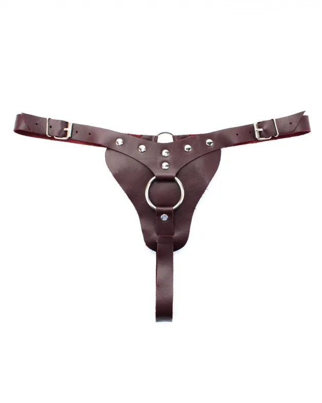 Трусики выполнены из  натуральной  кожи бордового цвета.  Спереди находится металлическое кольцо для страпона. Изделие фиксируется ремнями и пряжками, позволяющими подобрать нужный размер. Сочный и дерзкий аксессуар поможет  воплотить задуманное в реальность!