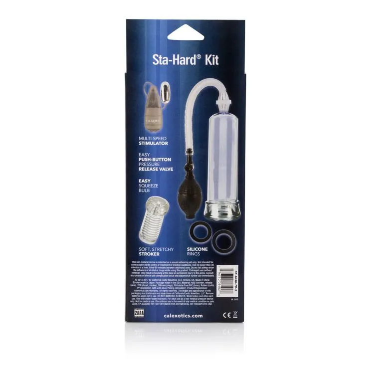 Набор Sta-Hard Kit содержит все, что Вам нужно, чтобы улучшить свою чувствительность и получить максимальное удовольствие во время интимной близости. В комплекте набора Вы найдете помпу для пениса с фланцевым основанием и съемной насадкой, пару хорошо тянущихся эрекционных колец, насадку на пенис и вибропулю с пультом управления. Предметы из набора Вы можете использовать по отдельности в разное время или одновременно для получения наиболее сильных ощущений.