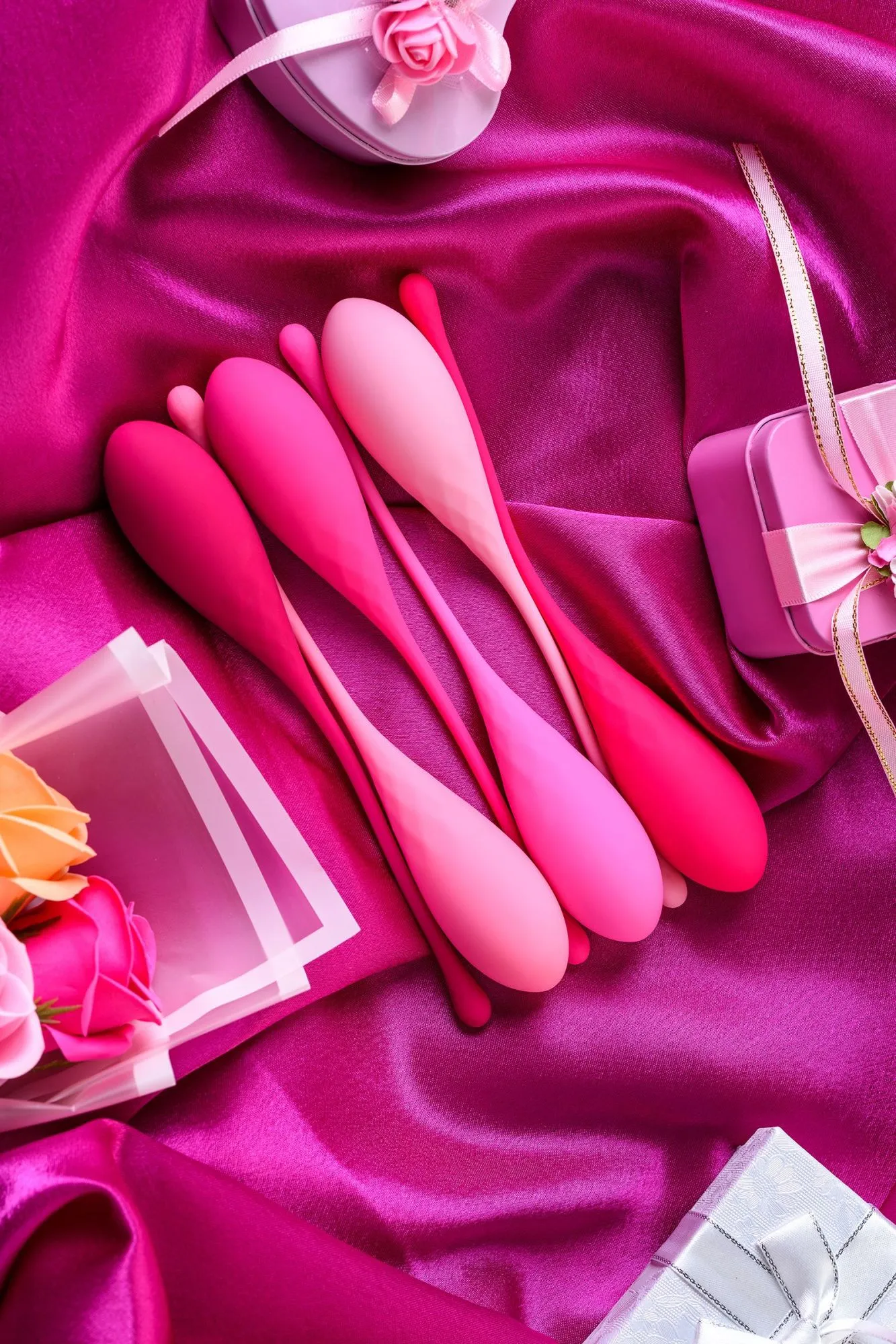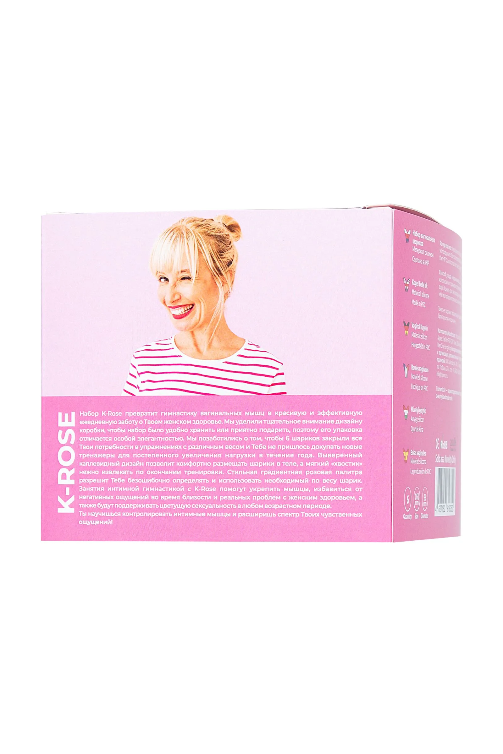 Набор K-Rose превратит гимнастику вагинальных мышц в красивую и эффективную ежедневную заботу о Твоём женском здоровье. Мы уделили тщательное внимание дизайну коробки, чтобы набор было удобно хранить или приятно подарить, поэтому его упаковка отличается особой элегантностью. Мы позаботились о том, чтобы 6 шариков закрыли все Твои потребности в упражнениях с различным весом и Тебе не пришлось докупать новые тренажёры для постепенного увеличения нагрузки в течение года. Выверенный каплевидный дизайн позволит комфортно размещать шарики в теле, а мягкий «хвостик» нежно извлекать по окончании тренировки. Стильная градиентная розовая палитра разрешит Тебе безошибочно определять и использовать необходимый по весу шарик. Занятия интимной гимнастикой с K-Rose помогут укрепить мышцы, избавиться от негативных ощущений во время близости и реальных проблем с женским здоровьем, а также будут поддерживать цветущую сексуальность в любом возрастном периоде. Ты научишься контролировать интимные мышцы и расширишь спектр Твоих чувственных ощущений! В наборе 6 вариантов веса для увеличения нагрузки: 50 г, 65 г, 80 г, 95 г, 110 г, 130 г