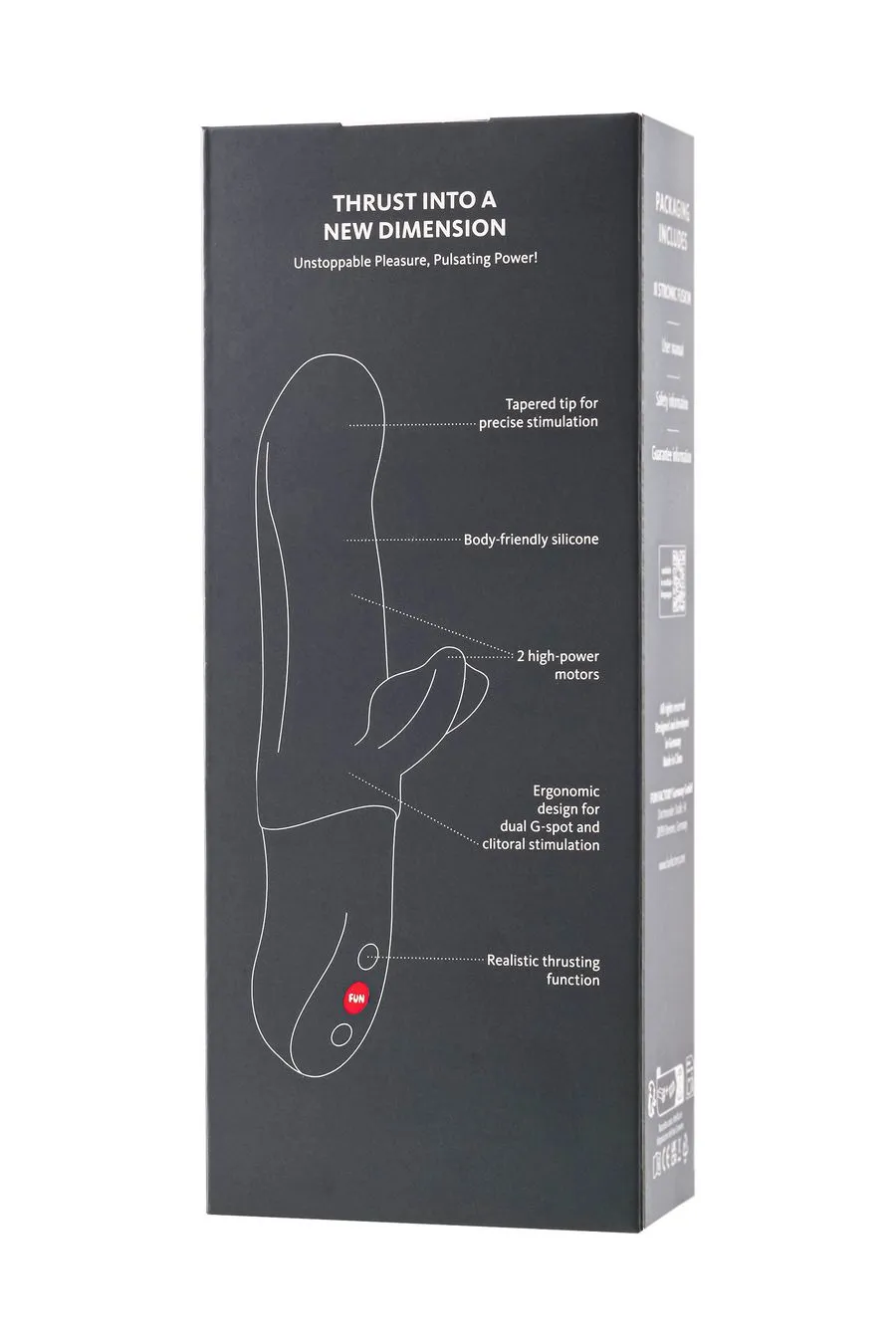 Больше, чем просто игрушка – революция в удовольствии! BI STRONIC FUSION – это нечто большее, чем просто игрушка: глубокие, реалистичные поступательные движения и интенсивная вибрация – непрерывные ощущения с каждым нажатием. Пульсирующее движение оказывает волшебное воздействие на вашу точку G, а изящный клиторальный стимулятор с крылышками одновременно ласкает клитор и половые губы. Длина 22 см, диаметр 4 см, сужающийся наконечник обеспечивает целенаправленную стимуляцию.
