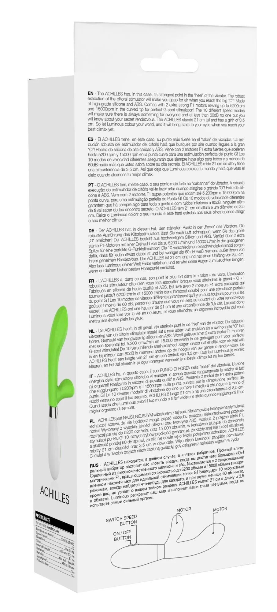 Вибратор-кролик – Achilles имеет округлую утолщённую головку и гибкий клиторальный отросток, что делает стимуляцию более яркой. Вибромассажер имеет два мощных двигателя, по одному в каждом отростке, имеющих 10 функций вибрации, способной достигать на вагинальном стволе до 7000 и на клиторальном отростке до 5200 оборотов в минуту, при этом уровень звука не превышает 60 дБ.