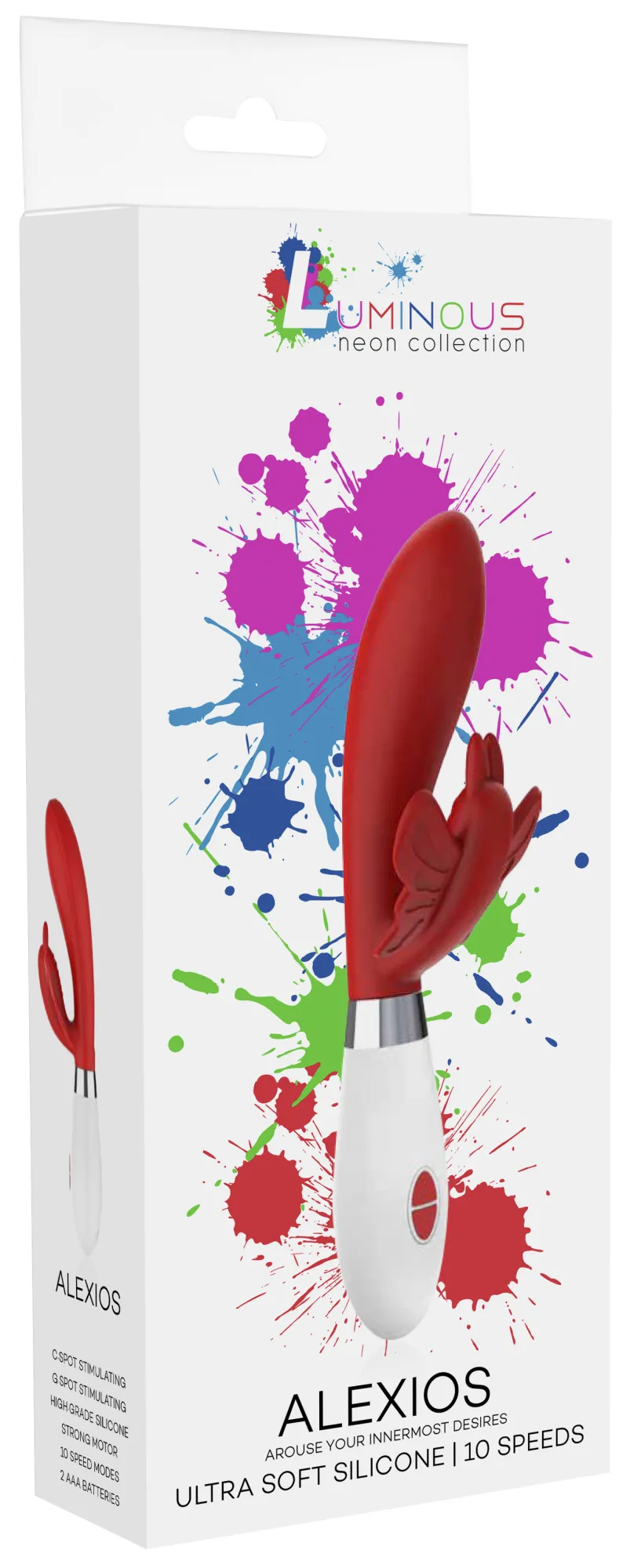 Вибратор - кролик Alexios имеет округлую утолщённую головку и гибкий клиторальный отросток, что делает стимуляцию более яркой. Игрушка имеет два мощных двигателя, по одному в каждом отростке, имеющих 10 функций вибрации, способной достигать на вагинальном стволе 15000 и на клиторальном отростке 5200 оборотов в минуту, при этом уровень звука не превышает 50 дБ.