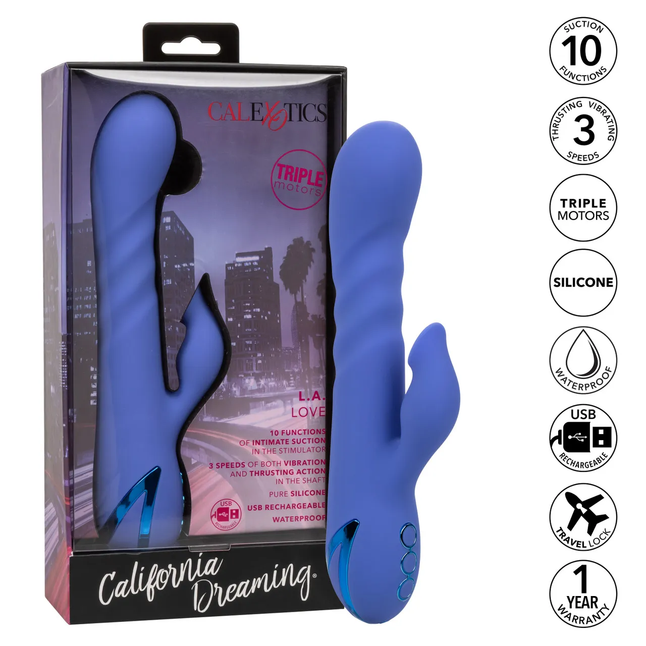 California Dreaming L.A. Love – перезаряжаемый мульти скоростной вибратор кролик из бесшовного материала с дополнительной обработкой. Вагинальный отросток у этой модели имеет 3 функции «интенсивное поступательное воздействие». Клиторальный отросток имеет отдельный мощный виброэлемент, обеспечивающий 10 режимов интенсивного всасывания.
