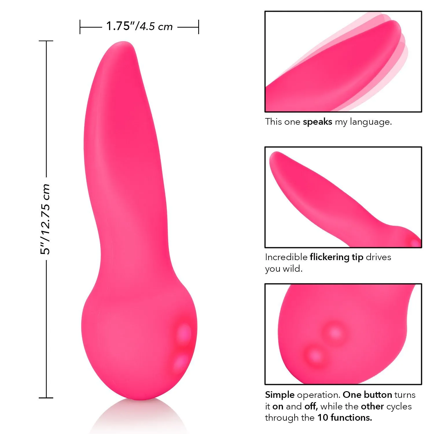 Mini Marvels Silicone Marvelous Flicker - это минивибратор от известной компании California Exotic, выполненный в форме язычка. Под действием вибрации кончик игрушки будет точечно ласкать Ваши эрогенные зоны, доводя Вас до немыслимого блаженства. Он обладает 10 функциями вибрации, пульсации и эскалации, которые смогут полностью удовлетворить все Ваши желания!
