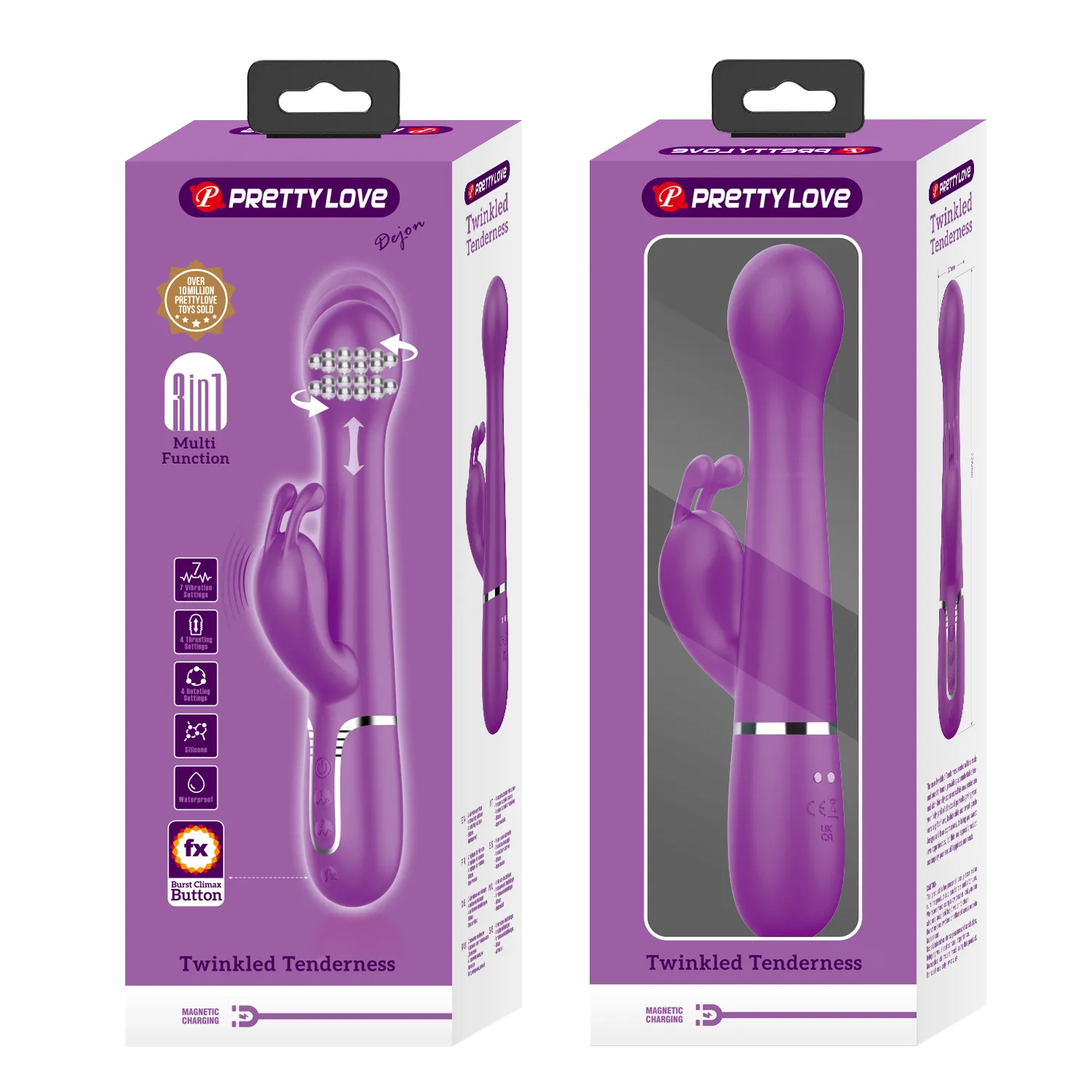 Вибратор Twinkled Tenderness от бренда PRETTY LOVE предназначен для вагинальной и клиторной стимуляции. Изготовлен из безопасных для тела материалов — силикона и ABS. Вибратор оснащен двумя моторами: один расположен в наконечнике, другой — в наружном отростке. Устройство предлагает 7 режимов вибрации, 4 функции вращения и 4 режима толчков. Однорядные жесткие шарики внутри ствола обеспечивают дополнительную стимуляцию. Заряжается через магнитный USB кабель, что делает его удобным для использования. Размеры вибратора: длина 226 мм, диаметр 37 мм, длина рабочей части 125 мм. Вес устройства составляет 196 граммов.