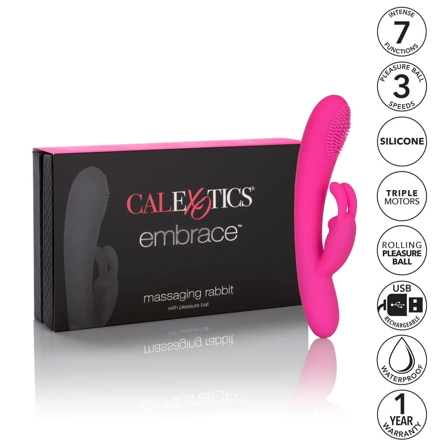 Embrace Massaging Rabbit - это мощный двойной вибратор от известной компании California Exotic с тройным двигателем и функциями вибрации, эскалации и пульсации.