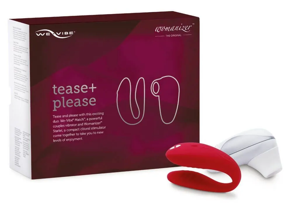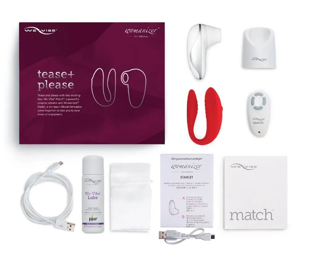 В подарочный набор Tease & Please входят две секс-игрушки: клиторальный стимулятор Starlet (белый) от немецкой компании Womanizer и вибратор для пар Match (красный) от канадской компании We-Vibe. Оба этих бренда производят высокотехнологичные игрушки в стильном дизайне. Со Starlet и Match в одном комплекте Вы сможете получить двойное удовольствие во время любовной игры соло или в паре.