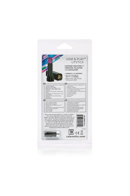 Hide & Play Lipstick – миниатюрный вибромассажер, выполненный в виде простой помады. Корпус изготовлен из гладкого, не содержащего фталатов АБС-пластика, покрытого атласным полеуретановым покрытием, а головка выполнена из гипоалергенного силикона. Мощный мотор обеспечивает мультискоростную вибрацию.