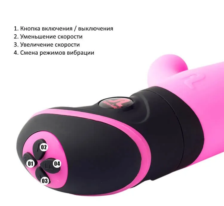 Игрушка сделана из медицинского силикона, приятного на ощупь благодаря своей бархатистой текстуре. Этот материал не содержит фталатов, он непористый и полностью гипоаллергенный. Вибратор оснащен двумя мощными, но тихими моторчиками, расположенными в стволе и стимуляторе клитора. Режимы и скорости настраиваются 4 кнопками в основании корпуса игрушки. Батарейки в комплект не входят.