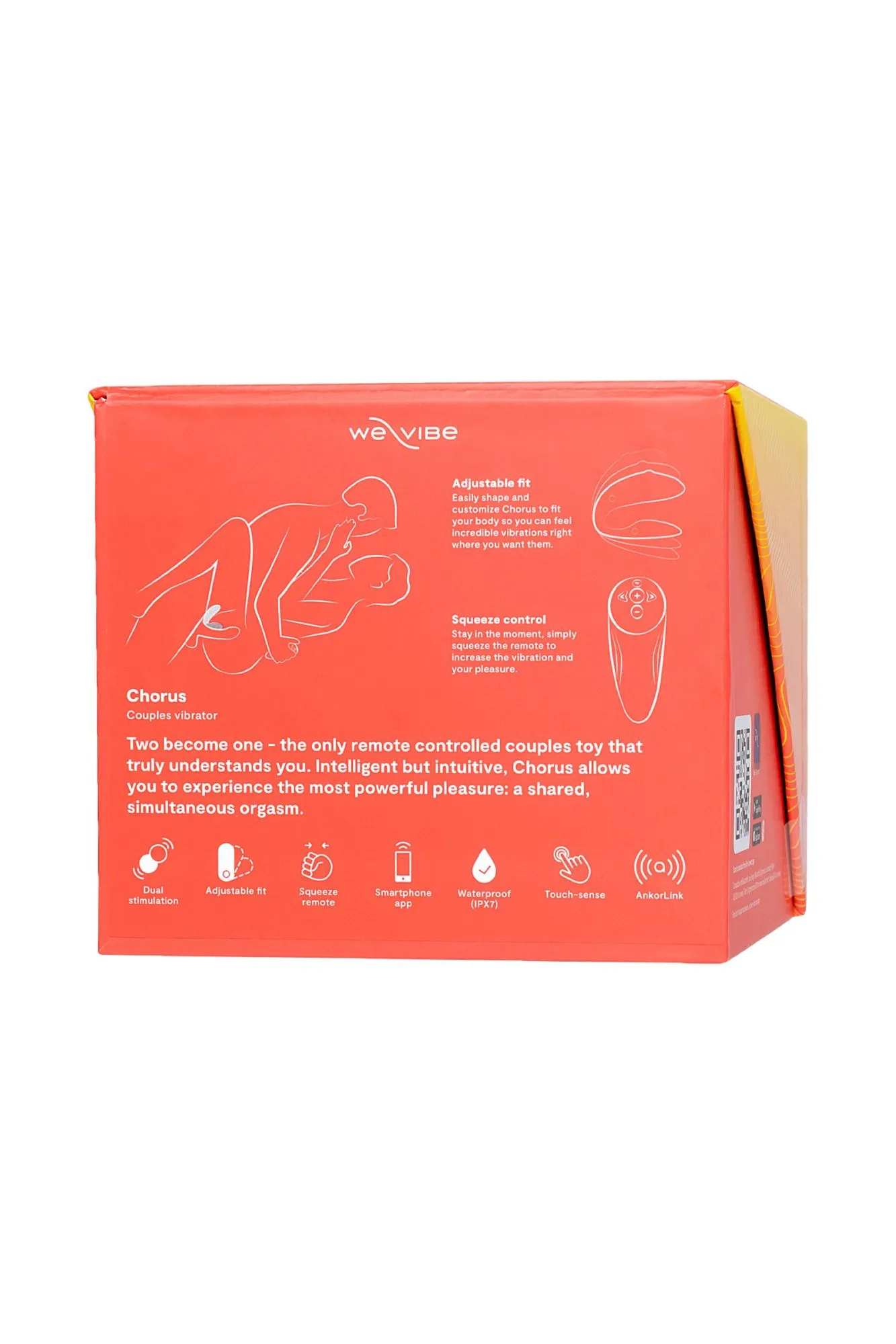 Вибратор для пар от We-Vibe с интуитивным управлением - забудьте о кнопках, просто сжимайте сенсорный пульт в ладони, чтобы увеличить силу вибрации. Chorus имеет 10 встроенных режимов и бесконечное количество настраиваемых - вы можете создать любой рисунок вибрации в приложении We-Connect и управлять вибратором с помощью смартфона. Chorus полностью водонепроницаемый, покрыт безопасным силиконом и изменит свою форму, чтобы стать удобным именно для вас.
