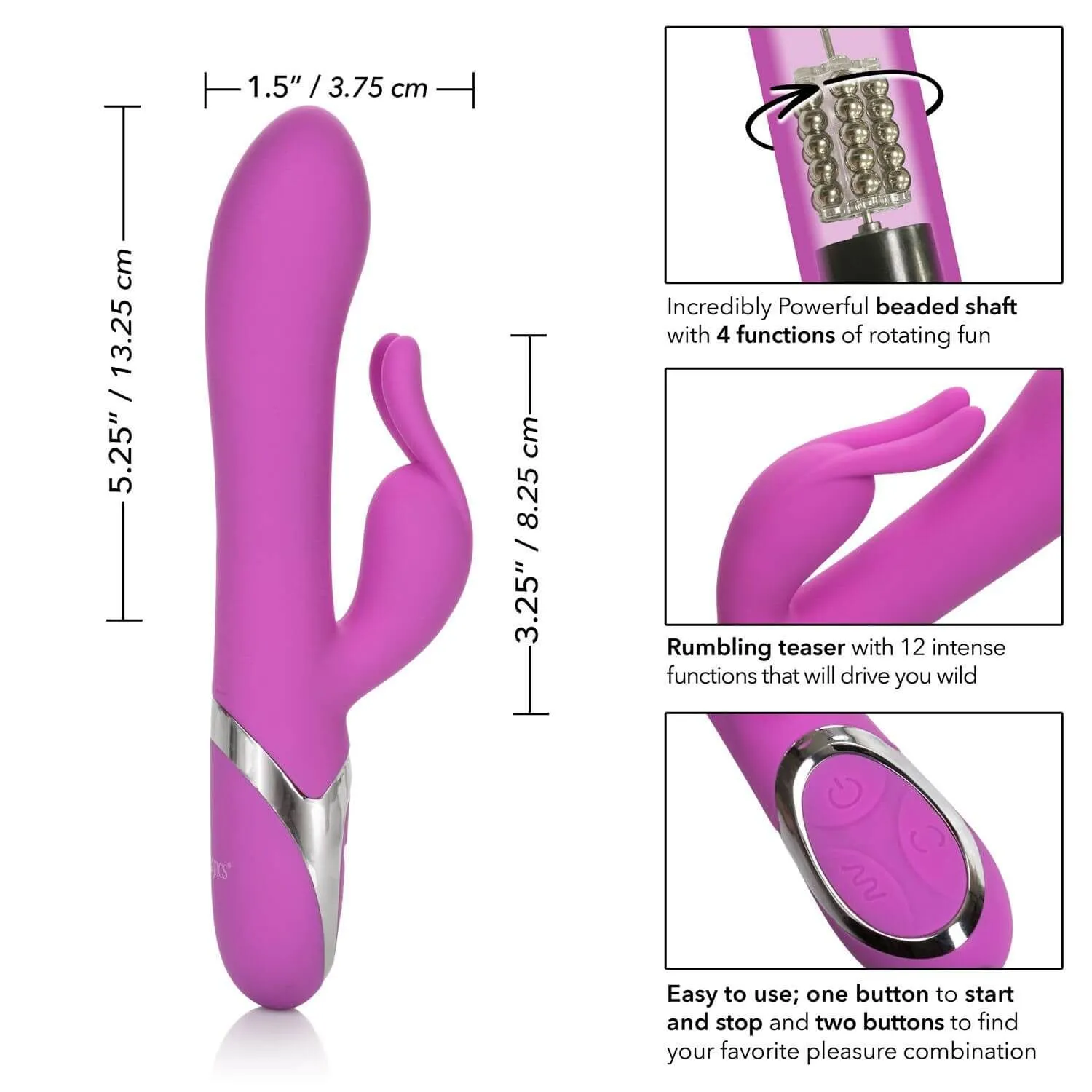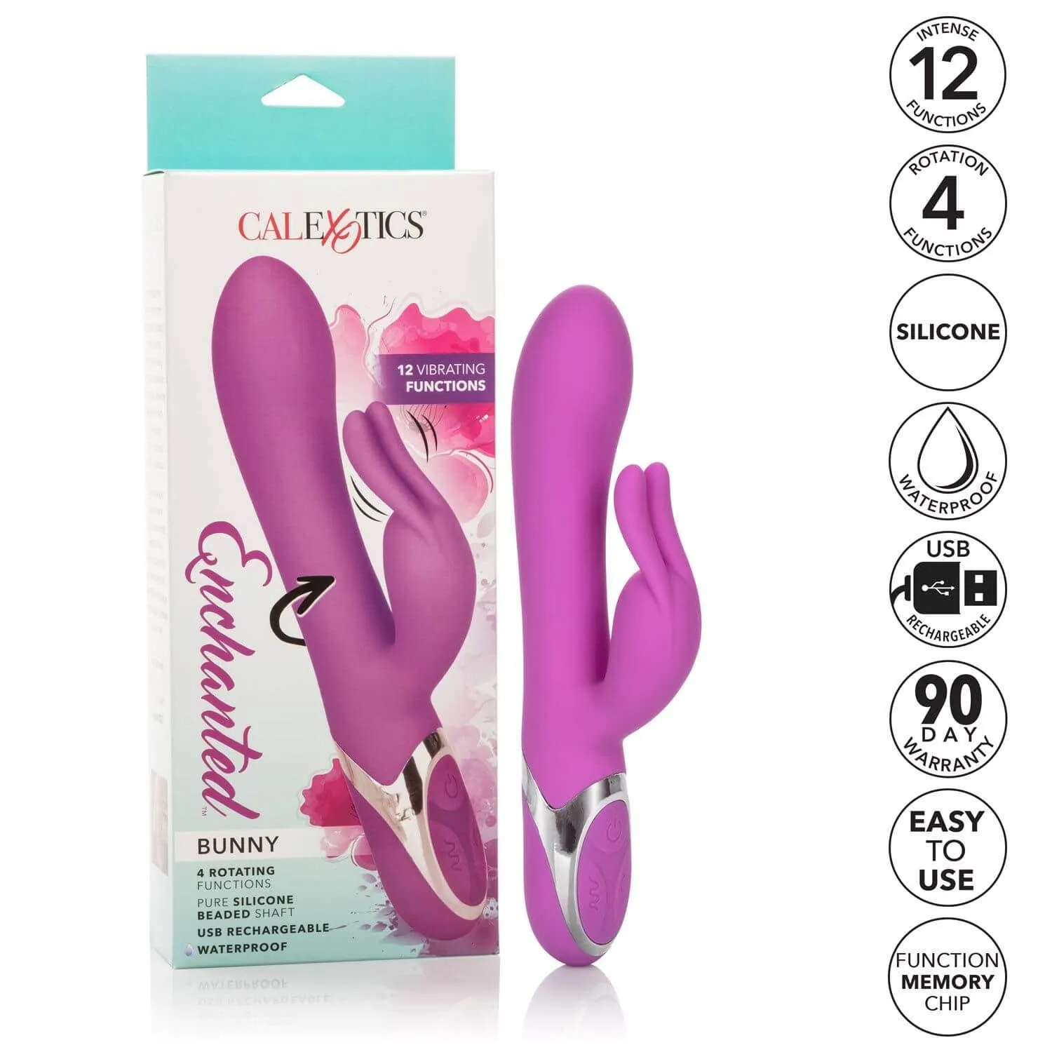 Enchanted Bunny выполнен из качественного медицинского силикона. Этот материал полностью гипоаллергенен и не содержит фталатов. Управление вибратором происходит при помощи трех кнопок, расположенных в основании. А благодаря функции запоминания последнего использованного режима, Вы сможете начать с того момента, на котором остановились в прошлый раз. Вибратор оснащен перезаряжаемым аккумулятором, а также LED индикатором уровня заряда.