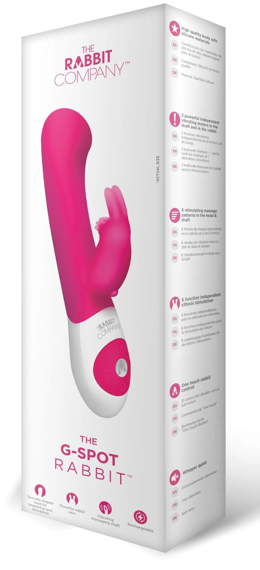 The G-Spot Rabbit - это идеальный вибратор "кролик" для стимуляции точки G от компании The Rabbit Company, изготовленный из высококачественного и бесшовного медицинского силикона. Вибратор оснащен двумя независимыми двигателями, которые обеспечивают шесть бесшумных функций вибрации и пульсации. Его головка разработана таким образом, что позволяет быстрее обнаружить точку G. Таким образом Вам гарантирована более точная стимуляция этого заветного места, способного доставить незабываемое удовольствие любой женщине! Позвольте себе погрузиться во множественные оргазмы с вибратором The G-Spot Rabbit!