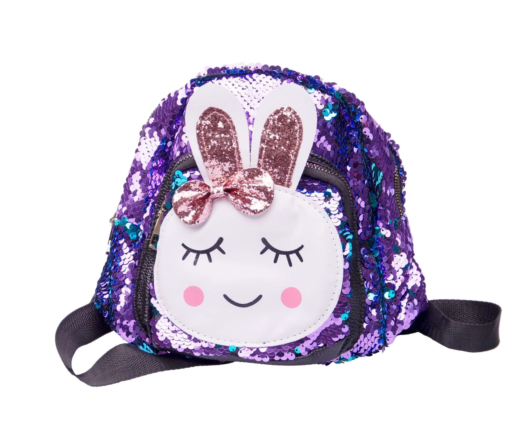 • с лицевой стороны рюкзак украшен мордочкой и блестящими ушками зайца со сверкающим бантиком