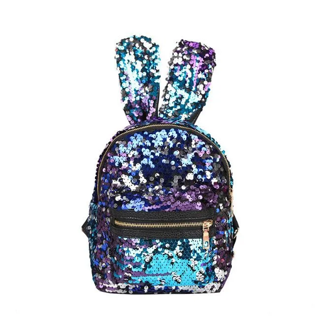 Очаровательный сине-фиолетовый рюкзак с ушками, усыпанный переливающимися пайетками.